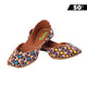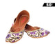 Green jaal on white leather mojari with sequin highlights and silver zari hand embroidery and sole cushioning.