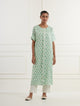 A perfect easy- fit sea green kaftan kurta in a mesmerising geometric block print featuring a centre pleate adorned with intricate embroidery. Paired with off-white cotton pants it's a chic set for work, casual outings or a fun brunch.