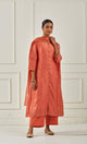 A charming pink cotton slub kurta and pant set with intricate detailing at the neck ,pockets and sleeves. Paired with offwhite embroidered slim pants and pink chanderi dupatta , this piece exudes elegance and adds a touch of sophestication and subtle shimmer. Perfect for intimate occassions, outings and work , this piece will brighten your day.